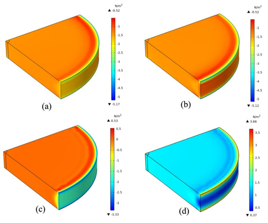 In this work, we simulated the distribution of stress in different directions and body stress under 17,000 W/cm2 laser power density irradiation. Figure 3a–d shows the typical stress of σxx, σyy, σzz and σv on Mises stresses on the surface of silicon samples, respectively. The value of the tensile stress shown is greater than zero and the compressive stress is less than zero. For the stresses σxx and σyy, the maximum compressive stress is located at the geometric center of the entire optical element which is the spot position [42]. Its value is 5.17 N/m2. On the other hand, the maximum stress of σzz is only 3 N/m2, which is relatively small. For the equivalent stress σv, the maximum tensile stress is located at the geometric center of the entire optical element. Its numerical is 3.66 N/m2.