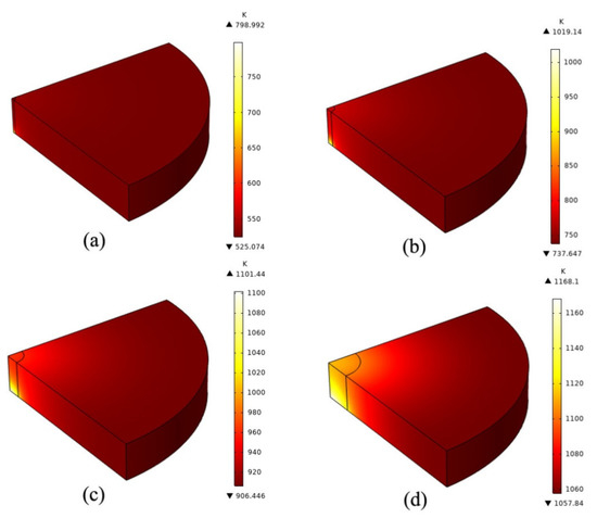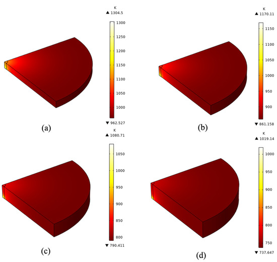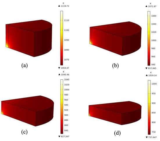 (a–d) are the temperature change in the center of silicon wafers with different radii (10 mm, 15 mm, 20 mm, 25 mm) at the end of 60 s continuous laser beam irradiation, respectively.