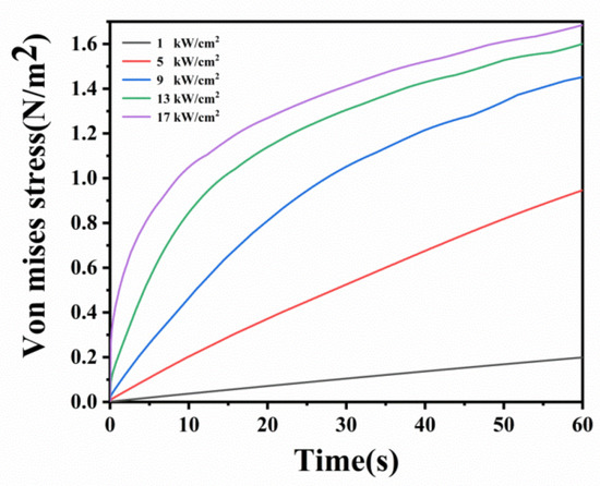 Schematic diagram of the variation of the Von Mis stress (σv) at the center of the laser beam at the laser power densities of 1000, 5000, 9000, 13,000 and 17,000 W/cm2.