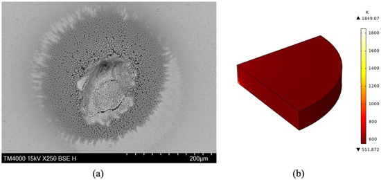 In this study, we tested the damage of a monocrystalline silicon mirror with a radius of 25 mm, a thickness of 5 mm. During the experiment, we selected a mid−infrared Quasi−Continuous Wave(QCW) laser for testing. The laser works in TEM00 mode and laser pulses. The width τ = 25−30 ns, the repetition frequency is 17 kHz, and the average power density is 437,898 kW/cm2. We used EDS−SEM to observe the typical damage morphology on the surface of single crystal silicon, as shown in Figure 8a. We can find traces of ablation and melting in the center of the spot. At the edge of the ablative area, there are cracks generated during cooling and solidification. In addition, we can find that there are a lot of small particles around the ablation area, which is mainly caused by the huge temperature gradient along the radial direction [60,61]. In Figure 8b, we simulated the experiment process with the same power density. We can find that the temperature at the center of the silicon mirror can reach 1849.07 K, which is much higher than the melting point 1683.15 K of silicon. The simulation results are consistent with our experimental results. In addition, after the laser loading process, the temperature of the silicon mirror edge is only about 600 K, and the lowest temperature is 551.872 K. The difference with the central temperature is about 1300 K, which is consistent with our experimental situation.