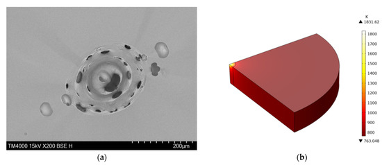 In addition, we also selected a mid−infrared Continuous Wave(CW) laser to test the damage of a monocrystalline silicon mirror with a radius of 25 mm, a thickness of 5 mm during the experiment. The laser power is 1500 W and the laser focused spot size is approximately 3 mm. We also used EDS−SEM to observe the typical damage morphology on the surface of the monocrystalline silicon, as shown in Figure 9a. We can also observe traces of ablation and melting at the spot. Numerous ablation holes are generated throughout the ablation area during cooling and solidification. In addition, the largest ablation holes are generated in the centre of the ablation area, mainly because of the temperature gradient in the radial direction [61]. In Figure 9b, we simulated the experiment process with the same power density. In the simulation, we replaced the heat source with a surface heat source. We can find that the temperature at the center of the silicon mirror can reach 1831.62 K, which is much higher than the melting point 1683.15 K of silicon. The simulation results are consistent with our experimental results as shown in Figure 9a. In addition, after the laser loading process, the temperature of the silicon mirror edge is only about 800 K, and the lowest temperature is 763.048 K. The difference with the central temperature is about 1068 K. When QCW and CW lasers irradiate the surface of optical components, the physical mechanism is approximately the same, and both are thermally induced damage. The specific mechanism is as follows: when QCW and CW lasers irradiate the surface of the optical element, the optical element absorbs the energy of the laser and the energy is converted from light energy to heat energy. When a defect exists in an optical element, it creates a temperature gradient difference within it. When the energy absorbed by the element reaches the material’s own limit, it causes damage to the element, which leads to thermally induced damage [62,63,64]. Hence, the effect of selecting QCW and CW lasers is the same in terms of average power during simulation and experiment. Therefore, our simulation results can provide a theoretical basis for thermal stress damage in silicon and predict the results of laser damage threshold testing.