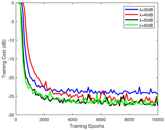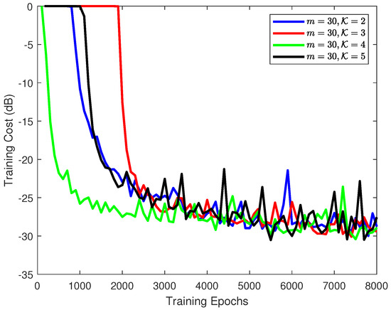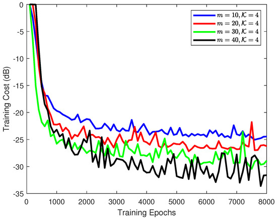 As the time step m was fixed to 40 and the kernel size was three, the training cost of the proposed scheme is demonstrated in Figure 3, where the training signal-to-noise ratio (SNR) varies from 30 to . As the results show, the loss curves with different tend to be stable gradually as the training epoch increases. The average final loss of the proposed scheme for , 50 and is around . In addition, it can be seen from the figure that the proposed scheme trained under the samples with a large converges faster than the one for a small , e.g., the case with costs about 2500 epochs to achieve convergence, whereas it would use 1800 epochs for the one of . In general, the quality of training samples indeed affects the learning ability of a customized DL model to a certain extent; however, it is not dominant in the training process.