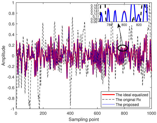 The time domain amplitude outputs of the proposed scheme and the original received are illustrated in Figure 6. For a fair comparison, the amplitude outputs of the ideal equalization case are also depicted here, where the channel information is perfectly known to the receiver. From the figure, it can be observed that the amplitudes of the original received are severely distorted as compared with the ideal case. However, with the help of an effective feature learning, the proposed scheme can exactly predict a similar amplitude output as the ideal case.