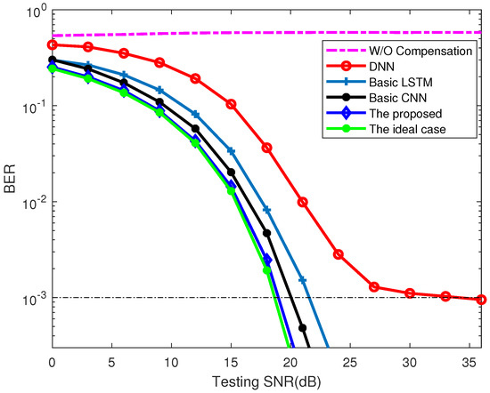 The corresponding BER performance is illustrated in Figure 8 as the testing SNR varied from 0 to 36 . In addition, the other three schemes in terms of the DNN [13], the LSTM [19], and the CNN compensator [21] are also presented here. In general, the proposed scheme has the closest BER performance to the one for the ideal case, and the BER accuracy of the DNN scheme tends to be saturated when is over . As for the same BER of , the proposed scheme can reduce the required SNR at least by as compared with the LSTM approach and nearly by as compared with the DNN method, which shows the superiority of the proposed scheme for nonlinearity mitigation. The channel characteristics can be perfectly revealed and then learned by the proposed scheme, and it can still work effectively even though the testing conditions are not exactly the same as the channel noise used in the training stage, which shows the good generalization ability of the proposed model. Besides, the CNN scheme can also provide an excellent BER performance as compared with the DNN and LSTM methods, because the CNN offers dilated convolutions, in which the convolution layer could handle the spatial information and store the memory. However, there will be more computation time in the training phase to achieve the convergence, which is analyzed next.