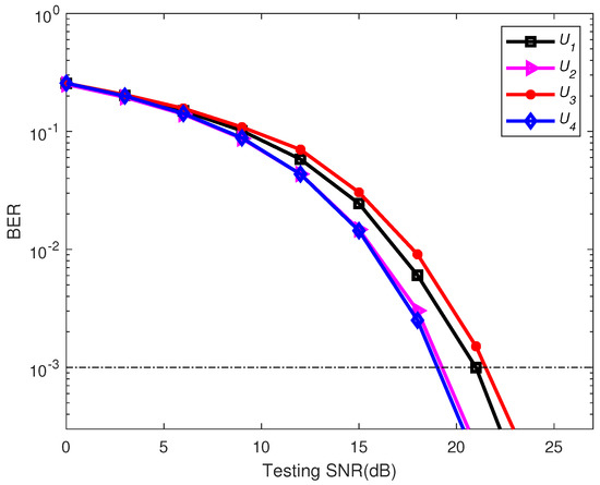 The well-trained model was valuated at different receiver locations. For convenience, the four PD locations with the root mean square (RMS) delay spread of 7.92, 8.2, 8.3, and 8.9 ns, marked as , , , and , were employed in the testing, respectively. The corresponding results are shown in Figure 9. As clearly seen from the figure, the BER performances of these four cases are very similar under the low-SNR region and only have a slight difference for a high SNR. Therefore, the proposed model can still work effectively and can provide robust BER performance even though the testing conditions are not exactly the same as those used in the training stage, showing a good robustness and generalization ability of the proposed scheme.