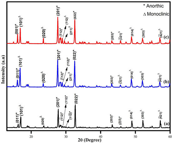 The XRD patterns of the WO3 nanoparticles synthesized with the aid of different chelating agents (phthalic acid, citric acid, and oxalic acid) are shown in Figure 1. The obtained XRD patterns of the synthesized nanoparticles are matched well with both anorthic/triclinic (JCPDS Card No: 83-0947) and monoclinic (JCPDS Card No: 83-09507) phases, which indicates that the synthesized nanoparticles are in mixed phases with good crystalline quality. On observing the XRD pattern, it was found that the peaks related to monoclinic phase of WO3 nanoparticles increases in the order of phthalic acid < citric acid < oxalic acid. Many studies highlighted the advantages of mixed-phase WO3 nanoparticles in enhancing the photocatalytic activity. The formation of mixed phases has been previously reported for WO3 nanostructures synthesized using a microwave-aided wet-chemical process [23], nano-crystalline WO3 obtained using a colloidal polymer crystal template [24]. The average crystallite sizes of the WO3 samples are estimated from the Scherer equation. The average crystallite size values were found to be 84 nm, 72 nm, and 63 nm for the samples synthesized using phthalic acid, citric acid, and oxalic acid, respectively, as the chelating agents. The variation in the crystallite size might be due to the influence of different chelating agents.