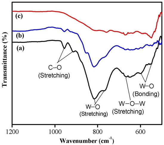 FTIR spectra of (a) phthalic-acid-, (b) citric-acid-, and (c) oxalic-acid-assisted WO3 nanoparticles.