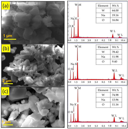 The morphological studies and the elemental composition of the WO3 samples were analyzed by SEM and EDX analyses. Figure 3 shows the SEM and EDX images of the WO3 nanoparticles synthesized using different chelating agents. SEM images of all the samples showed large, agglomerated particles having irregular shape, and this might be due to the high surface energy of nanoparticles. This result indicates that the chelating agent has no significant effect on the morphology of nanoparticles. The EDX pattern confirms the presence of W and O elements. Furthermore, the presence of a sodium (Na) peak due to the use of sodium tungstate as precursor in the synthesis process was observed [26]. The peaks representing the impurity elements are absent in all the samples.