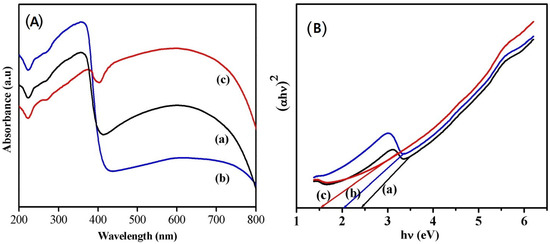 (A) UV–vis absorption spectra and Tauc’s plot (B) of phthalic acid (a), (b) citric acid, and (c) oxalic acid assisted WO3 nanoparticles.