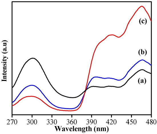 The room temperature PL spectra of the samples shown in Figure 5 were obtained using an excitation wavelength of 250 nm with 150 W Xenon lamp as the source. It was observed from the spectra that all three samples have broad-level emissions approximately around 300 nm (ultraviolet band), which originates from the exciton recombination and is usually referred to as near-band-edge emission (NBE). A weak shoulder peak seen as a bluish green emission around 466 nm is due to the presence of defects or oxygen vacancies in the nanostructures [27]. The peak corresponding to NBE seems to be decreased for oxalic-acid-assisted WO3 nanoparticles, but the intensity of the peak arising from defects or oxygen vacancies seems to be higher, which indicates the presence of more defects in it. It has been reported that the oxygen vacancies/interstitials on the surface of metal oxide nanoparticles can act as a scavenger of electrons and holes, which will reduce the recombination of photogenerated electrons and holes, and it is the prime factor responsible for enhancing the degradation efficiency of a catalyst [28]. Hence, it is expected that the WO3 nanoparticles synthesized using oxalic acid will exhibit better catalytic dye-degradation efficiency compared to the others.