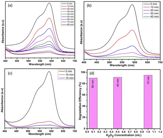 The degradation activity of crystal violet can be effective by the appropriate addition of hydrogen peroxide. The electron–hole recombination represents the main cause for low efficiencies and is limited by the use of oxidant systems such as hydrogen peroxide. By adding H2O2, higher efficiencies are obtained, confirming that the electron–hole pair recombination is reduced [29]. Thus, the effect of hydrogen peroxide oxidant on CV removal by WO3 nanoparticles was studied at different hydrogen peroxide concentrations by maintaining the catalyst dosage (10 mg) and dye concentration (10 ppm) as constant. Figure 8 indicates that the dye-degradation efficiency is directly proportional to H2O2 concentration. The degradation time seems to be reduced from 80 to 15 min while using 1 mL of H2O2. This enhanced degradation efficiency is due to the efficient separation of electron–hole pairs, which might be due to the electron accepting nature of H2O2 [30,31]. In aqueous solution, to generate ●OH radicals, the holes at the surface are scavenged by surface hydroxyl groups and water molecules. Now, the dye molecules are oxidized to the final products, i.e., H2O and CO2, because of the very strong oxidizing agent ●OH radicals [2].