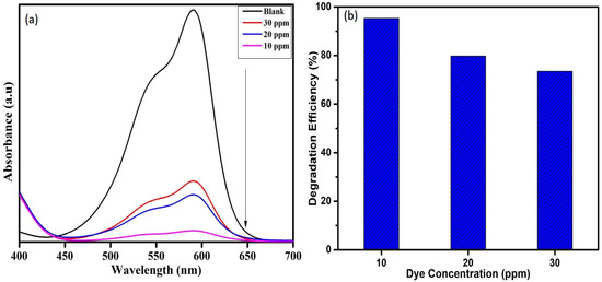 To study the effect of dye concentration on degradation of crystal violet dye, the concentration was varied as 10, 20, and 30 ppm while keeping the other parameters such as catalyst dose (1 mg) and H2O2 (0.5 mL) as a constant. It was found that 10 ppm dye degraded 95%, whereas the 20 and 30 ppm dyes degraded 79 and 73% in 135 min, as shown in Figure 9. Degradation time increases with increasing dye concentration. The dye solution at higher concentration hinders the penetration of photons to the catalyst surface, which in turn suppresses the effectiveness of the catalyst in degrading dye molecules [32,33].