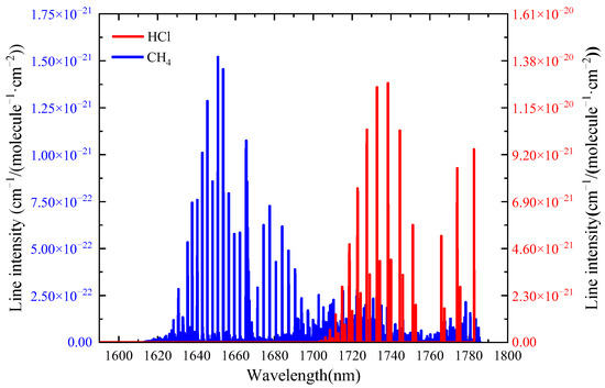 The crux of selecting the absorption peak of the measured gases in the mixed gas is to avoid the interference of other gas molecules, and the intensity of the selected absorption line is strong enough to ensure a high SNR. Figure 1 shows the near infrared absorption spectra of methane and hydrogen chloride based on HITRAN database [25], the HCl absorption line located at 5723.27 cm−1 (1747.26 nm) and the CH4 absorption line located at 6046.96 cm−1(1653.72 nm) meet the measurement requirements, where the intensities of two absorption lines are 1.27 × 10−20 cm−1/(molecule−1·cm−2) and 1.42 × 10−21 cm−1/(molecule−1·cm−2) respectively. The absorption coefficient (@ 296 K, 1 atm) is 0.3669 cm−1 for CH4 (6046.96 cm−1) and 1.081 cm−1 for HCl (6046.96 cm−1).