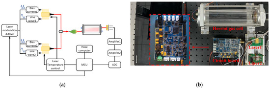 The structure of the designed multi-gas sensor: (a) Schematic structure of the FDM-WMS multi-gas detection system.; (b) Photo of the detection platform and the homemade circuit board.