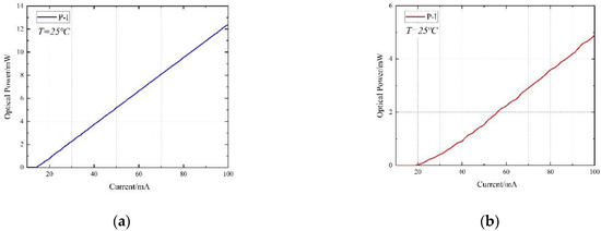 Variation of the DFB laser output power with driving current: (a) The P-I (power-current) curves of the laser for CH4 detection.; (b) The P-I curves of the laser for HCl detection.