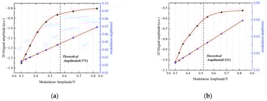 In order to improve the performance of the detection system, the modulation depth needs to be optimized to ensure a high SNR. The optimum modulation amplitude is 2.2 times of half width at half maximum (HWHM) [27]. According to the data from HITRAN, current tuning coefficient and modulation current/voltage relationship, the optimal modulation voltage can be calculated as 0.57 V for CH4 and 0.52 V for HCl. Therefore, 0.55 V is selected as the modulation voltage amplitude of DFB laser. The influence of modulation amplitude is demonstrated in Figure 6.