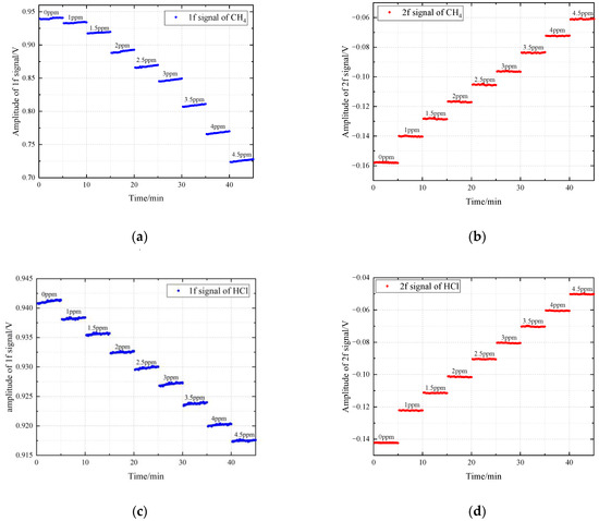 Measured first and second harmonic signals of CH4 and HCl at different concentrations: (a) first harmonic signal of CH4.; (b) second harmonic signal of CH4.; (c) first harmonic signal of HCl.; (d) second harmonic signal of HCl.