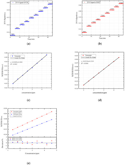 A series of test points have been used to test the accuracy of the fitting curves. Figure 8e shows the eight random test points and the error values calculated from the fitting curves Figure 8. The maximum absolute error is 0.48 ppb for CH4 and 0.5 ppb for HCl. Meanwhile, the maximum relative error is 0.37% and 0.65% for CH4 and HCl respectively. The deviation analysis shows slight fluctuation of test values, and illustrate great stability and high accuracy of the system.
