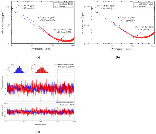 An Allan-Werle deviation analysis was performed in the gas mixture of 5 ppm CH4 and 5 ppm HCl to evaluate the stability and MDL of FDM-WMS detection system [28], the results are shown in Figure 9a,b. The MDL of the system is calculated to be 30.16 ppb for CH4 and 31.6 ppb for HCl for the integration time of 15 s. By increasing the integration time, the corresponding MDL can be further improved to 11 ppb for CH4 and 13.1 ppb for HCl. Furthermore, a long-term detection of CH4 and HCl standard gas mixture was carried out to test the measurement precision of the FDM-WMS system, as shown in Figure 8c. It shows that the maximum relative error is 2.61% for CH4 and 3.19% for HCl.