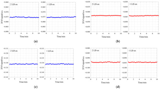 A control experiment was performed in the gas mixture of CH4 and HCl with different concentration to explore the influence of measured WMS-2f/1f signals with and without the FDM technique. During the experiment, first keep both DFB lasers working, and then turn off one laser respectively. The results are shown in Figure 10. The results indicate that the influence on the 2f/1f signal from the FDM method is slight.