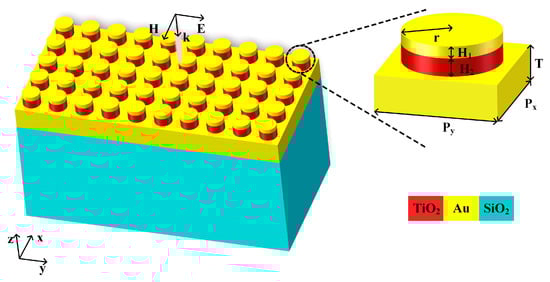 Figure 1 shows a schematic diagram of the proposed metasurface carbon dioxide gas sensor with periodical Au-disk/TiO2-cylinder/Au-film cells, which define the three layers of the resonator. Instead of a continuous insulator film to restrict the near fields inside the interlayer of the resonator [], a discrete insulator layer (TiO2-cylinder) is employed to expand the interaction area between the evanescent fields and the gas molecules to be detected. Accounting for the practical application, the unit cell was located on the top of the SiO2 substrate with a refractive index of 1.45. The thicknesses of the Au disks and TiO2 nanocylinders are represented by H1 and H2, and their radius is r. The thickness of the Au layer is represented with D. Px and Py represent the period length of a unit cell in the x- and y- directions, respectively. The geometric parameters are fixed at Px = Py = 650 nm, r = 270 nm, H1 = 25 nm, H2 = 40 nm.