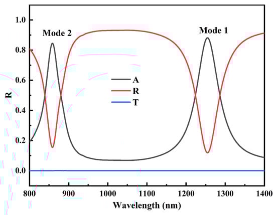 Absorption (A), reflection (R) and transmission (T) spectra of the proposed metasurface.