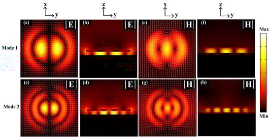 To explain the physical mechanism more clearly for the two absorption peaks, the electric (|E|) and magnetic (|H|) field distributions of mode 1 and mode 2 in different planes are calculated as shown in Figure 3. The operation of the MIM resonator can be understood using a Fabry–Perot model [], in which the slow gap plasmons excited along the polarized y-direction are reflected at either end of the top metal feature. Different from the fundamental plasmonic mode in MIM metasurface with only a single “hot spot” in the magnetic field distribution [,], the two modes demonstrate two symmetric higher-order waveguide modes in the SWIR band.
