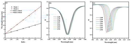 (a) The absorption peak wavelength of mode 1 (b) and mode 2 (c) with surrounding RI changing from 1.48 to 1.54.