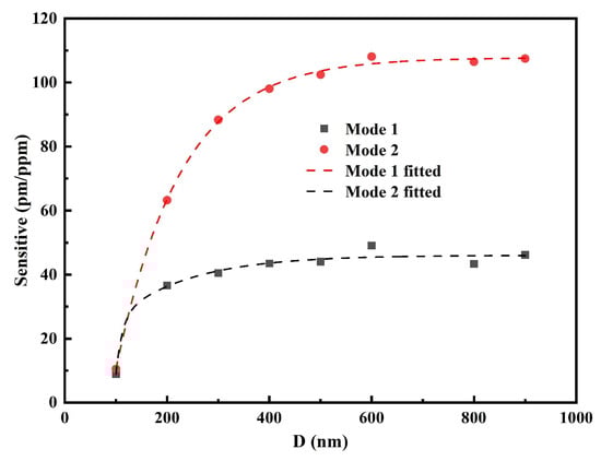 Finally, to improve application feasibility, the effect of PHMB gas-sensitive materials thickness (D) on CO2 gas sensing is calculated as shown in Figure 5. It indicates that the sensing sensitivity increases as D increases, but the increase rate of sensitivity slows down as the thickness increases. When D is greater than 600 nm, increasing D for sensitivity rise does not help significantly. Moreover, when D = 900 nm, the sensitivity of CO2 gas sensing is close to the situation that the metasurface is completely immersed in the PHMB environment discussed in Figure 4 above.