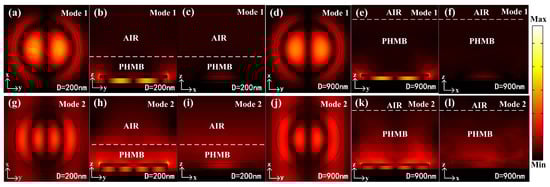 When the thickness of PHMB is thin (e.g., D = 200 nm), the near-field energy also permeates into the ambient air above PHMB (Figure 6b,c,h,i)). When D is increased (e.g., D = 900 nm), more energy is gathered inside the PHMB layer issuing in increased RI sensitivity, which is evident by Figure 6k,l,e,f. Moreover, the increased effect of PHMB thickness on sensitivity is more pronounced in mode 2 than mode 1 as shown in Figure 5, because of the more dispersive field distributions of mode 2 revealed by the contrast of Figure 6k,e. In practice, the thickness of PHMB influences the response time to gather CO2 gas for adequate reaction [,]. Therefore, the optimum thickness of PHMB gas-sensitive materials needs to be determined in experiments by measuring the relationship between PHMB thickness and response time.
