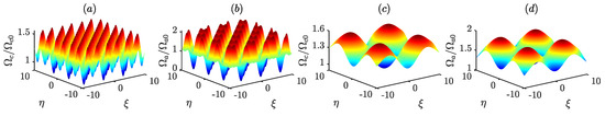 The pattern formations obtained by numerical simulation in Equation (6) are shown in Figure 6. When the width of the super-Gaussian potential is , the singer layer ring-shaped structure pattern with the smaller radius is obtained in Figure 6a. When we increase the width, i.e., and , the larger ring-shaped pattern is obtained in Figure 6b,c. Furthermore, the two or more two layers of a ring-shaped pattern with a hexagonal structure have been obtained with and much larger which is shown in Figure 6d.