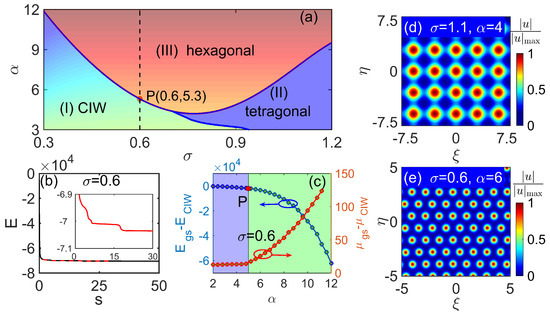 We first illustrate the phase diagram as functions of nonlocality degree and nonlinear interaction strength , with the range of constant intensity probe field amplitude from 3 to 12 and nonlocality degree from to in Figure 4a, which represents the emergence of the different phases from the constant intensity wave (labeled by “CIW”) solution (green region) to the tetragonal lattice (purple region) and hexagonal lattice (red region), respectively. We then track the system energy by minimizing . The inset in Figure 4b shows the energy change along , and its energy becomes lower, eventually remains unchanged, and comes to the ground state. To view the tendency of the energy change, we give the partially enlarged drawing inside the inset. We also show the difference in Hamiltonian energy (blue line in left y-axis) and propagation constant (red line in right y-axis) as functions of from 2 to 12 with in Figure 4c, which is corresponding to the vertical dotted line crossed from the point “P”, i.e., in Figure 4a with , and from 3 to 12. We find that the difference in Hamiltonian energy or propagation constant has a phase transition at point “P”.