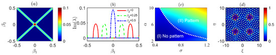 We use the Fourier collocation method [10,71] to study the MI of the CIW solution according to Equations (17) and (18). The eigenvalue equation tells us that if there exists an eigenvalue whose imaginary part is larger than zero, the solution is linearly unstable. Figure 3a–c show the growth rate as functions of and for different nonlocal nonlinearity , and 10, respectively. From the gain spectrum, we know there exists an instability interval in which the system undergoes from CIW to some other states when we increase the nonlinearity. Figure 3d is the cross section of the eigenvalue spectrum at as function of corresponding to , and 20 (from lines a to e), which further illustrates the instability interval increases with increasing. The results show that nonlocal nonlinearity is the key to MI.