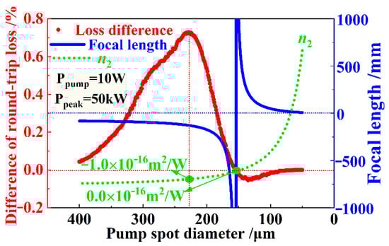 It can be seen from Figure 1 that the nonlinear reflective index n2 increases monotonously with decreasing pump spot size. Its value changes from negative to positive, and it is zero when the pump spot diameter is about 150 μm. Accordingly, when the value of n2 is negative, the absolute value of focal length increases with decreasing pump spot size, but the absolute value of focal length drops with falling pump spot size when n2 is positive. Obviously, the focal length of the Kerr-lens is infinite when n2 equals zero.