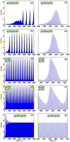 Simulated Q-switched ML with q0 = 2.0 and various g0. (a) g0 = 2.3, (b) g0 = 2.5, (c) g0 = 2.9, (d) g0 = 3.2, (e) g0 = 3.3. Figure (f–j) on the right display the corresponding pulse trains of (a–e) in a shorter time range.
