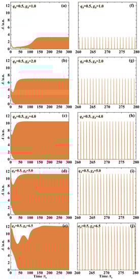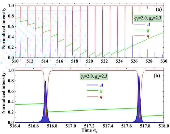 We numerically solve Equations (1)–(3) using the famous Runge-Kutta method, and the simulated Q-switched ML with q0 = 2.0 and various g0 are plotted in Figure 2. The horizontal axis is time (normalized by the cavity round-trip time tr), and the longitudinal axis is amplitude of light field (arbitrary unit). Figure 2a–e show the Q-switching envelope of mode-locked pulses in a longer time region, and (f–j) are their corresponding pulse train in a shorter time scale.