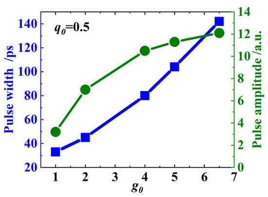Figure 5a–e show the evolution of calculated CW mode-locked pulses under different g0 when q0 = 0.5. Figures on the right side describe performance of the pulses in a smaller time range. As can be seen from Figure 5, if g0 is relatively small (figure (a)) or large (figure (e)), the time required for building a stable pulse is relatively longer. In all CW ML processes, the pulse amplitude gradually increases while the pulse width also increases with increased g0, as shown in Figure 6. Although the simulated pulse width cannot be strictly equal to that produced from the experiment (in fact, most reported pulse widths in SML are far small than the calculated pulse width here), the trend that pulse width increases with increased g0 in numerical simulation still has certain reference significance for experimental design.