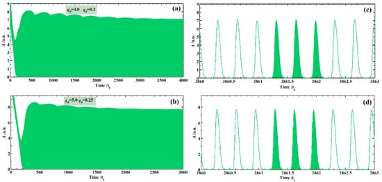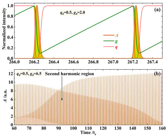 Figure 9a,b indicate the emergence and gradual enhancement of the second harmonic in a shorter and longer time range when g0 = 2 and q0 = 0.1. The second harmonic becomes steady after about 350 intracavity round-trips and maintains the same amplitude as the fundamental wave. Figure 9c shows the establishment of two intracavity circulating pulses in the corresponding net gain windows formed by the successively saturated absorption and gain.