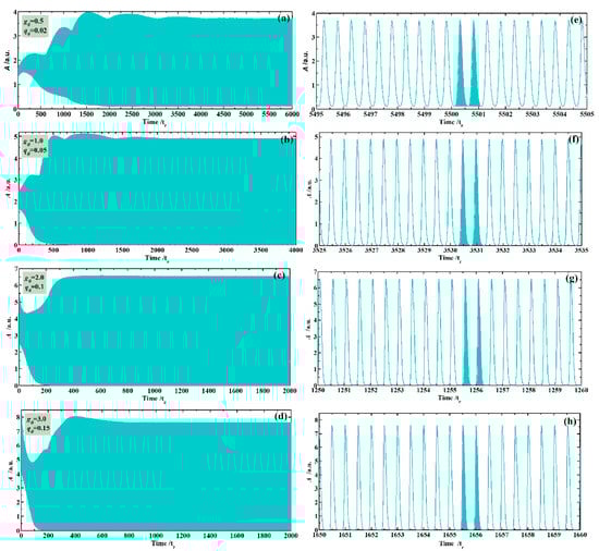 As mentioned above, when the gain is enlarged to a certain extent, pulse will be split and stabilized, and the CW ML in SML will change to harmonic ML. Figure 8a–d show the second harmonic ML obtained by different permutation of g0 and q0, where the value of g0 is about 20 times that of q0. Figure 8e–h on the right side are their corresponding pulses within ten round-trips. It can be concluded from Figure 8 that the pulse width will decrease with raising g0 and q0, and permutations of larger or smaller g0 and q0 all will need more intracavity cycles for harmonic ML to reach a stable state.