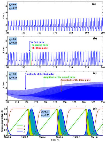 Figure 11a–c describe the occurrence and evolution of the second and third pulse in the cavity when g0 = 5.0 and q0 = 0.25. (a) shows that the second pulse is split on the right side of the first pulse before about 200 intracavity cycles. (b) depicts that the third pulse is generated on the left side of the first pulse after about 200 intracavity round-trips. (c) indicates the evolution tendency of amplitudes of the first, second and third pulses. (d) shows the amplitude of three pulses circulating in cavity and the corresponding changes of absorption and gain when the third harmonic ML is stable.