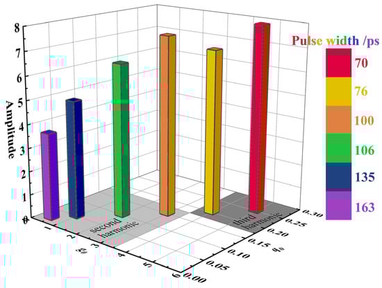We summarize the second harmonic ML in Figure 8 and the third harmonic ML in Figure 10 together, plotting it in Figure 12. The x-, y- and z-axis represent g0, q0 and the amplitude of electric field of mode-locked pulse, and the color bar on the right side represents the pulse width. In general, with increased g0 and q0, the pulse width in harmonic ML decreases, which is contrary to CW ML. The critical boundary of second and third harmonic ML is about g0·q0 = 0.6. When g0·q0 < 0.6, there are two pulses circling in the cavity, and when g0·q0 > 0.6, the third harmonic ML happens.