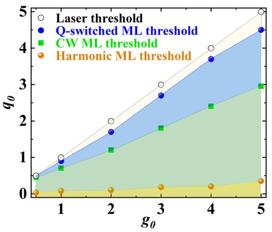 At last, the theoretical laser threshold (given by g = q − ln(κ)), the calculated Q-switched ML threshold, CW ML threshold and harmonic ML threshold are generalized in Figure 13. For fixed q0, after g0 exceeding the laser threshold, continually increased g0 will result the occurrence of Q-switched ML. CW ML can be obtained by further increasing g0, and the boundary of transition is g0~1.5–2 q0. The region of CW ML is significantly larger than that of Q-switch ML. When g0 goes beyond 15–20 q0, CW ML will evolve to harmonic ML. Obviously, the range of harmonic ML is minimal.
