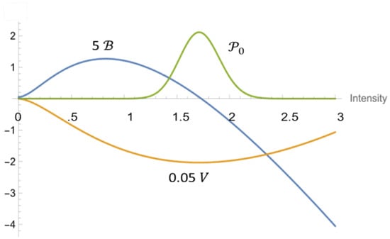 Drift (blue; ×5), potential V (yellow; ×0.05) and stationary intensity distribution (green; normalized to one) versus , for the case .