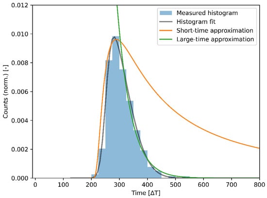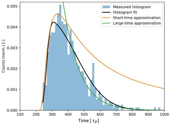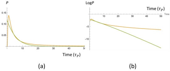 In Figure 5a, the two approximations for are depicted. The yellow curve is the large- approximation (24) for with , and, , while the green curve is the random-walk approximation (25). These data pertain to the situation of Figure 4. The two curves connect around . This can be seen more convincingly in the logarithmic plots of Figure 5b, which also illustrates that the long-time tail of the distribution decreases faster than exponentially (see (26)), i.e., much faster than the random-walk approximation.