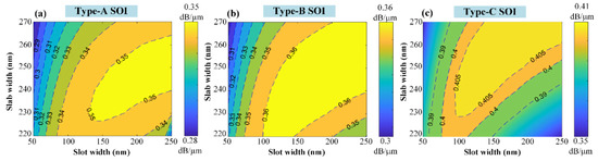 We optimize the slab width and slot width of the TBG/silicon slot hybrid waveguide to reach the maximum absorption coefficient with different types of SOI wafers, as shown in Figure 3. We can find that the highest absorption coefficient αTBG can be as high as 0.41 dB/μm when the slot width and slab width within the type-C SOI are chosen as 150 nm and 240 nm respectively. Moreover, for type-A and type-B SOI wafers, the highest αTBG are both higher than 0.35 dB/μm.