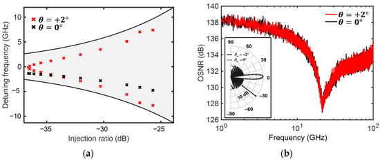 Finally, we confirmed the improvement in the OSNR with a low sidelobe level during beam steering. Note that beam steering and sidelobe reduction can be achieved by varying the two OIL laser parameters in a stable locking regime [7]. Figure 5a shows the assignment of injection-locking parameters to the 21 OIL lasers to achieve beam steering of 0° (black crosses) and 2° (red crosses) with a low sidelobe level of −30 dB. The appropriate assignment of the OIL parameters to the OIL-based OPA elements can be calculated based on the locking map, as reported in [7]. Figure 5b represents the corresponding OSNR performances of OIL-based OPA of beam steering at 0° (black) and 2° (red) with SLL of −30 dB. We confirmed that high OSNR performance was maintained at the same level at different beam-steering angles. The inset of Figure 5b shows the far-field radiation pattern of the OPA with a low sidelobe level of −30 dB for beam steering angles of 0° (dotted line) and 2° (solid line).