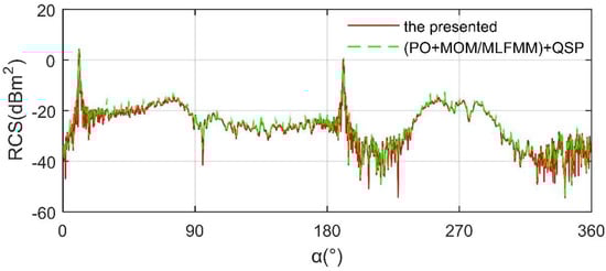 The verification of the presented calculation method is shown in Figure 3, where PO + MOM (method of moment)/MLFMM (multilayer fast multipole method) in FEKO is used to calculate the RCS curve of the target in a given state. QSP is used to generate the pitch angle and flapping angle of the wing in the given discrete state. It can be found that the two RCS curves are generally similar, including shape, peak and mean level, where the RCS mean of the presented calculation method is −18.3819 dBm2, that of the other curve is −17.9068 dBm2. When α = 0°, both RCS curves have peaks exceeding 4.279 dBm2, because the surface near the leading edge of the wing, the arc of the outer end of the wing and the lower surface of the wing all provide more scattering contributions.