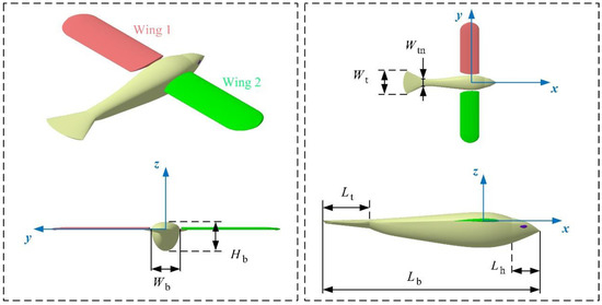 The model of the flapping wing aircraft with two U-type wings is established as shown in Figure 4, where the wing 1 is marked red and wing 2 is marked green. Lb is the length of the aircraft body, Lt is the length of the aircraft tail, Lh is the length of the aircraft head, Hb is the height of the aircraft body. Wb is the width of the aircraft body, Wt is the width of the aircraft tail, Wtn is the minimum width of the fuselage tail. Airfoil 1 represents the airfoil used in the wing cross section. The aircraft model with bird wing shaped wings is built as shown in Figure A1.