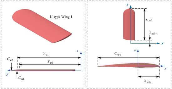 The details of the U-type wing are shown in Figure 5, where the plane profile of the wing is U-shaped, and the wing root is cut by curve. Lw1 is the length of the wing, Yw1r represents the distance from the wing root to the xz plane. Yu1 and Yu2 represent the distance at different spanwise sections of the U-type wing, Cu1 and Cu2 represent the chord lengths at different sections of the U-arc wing. Cw1 represents the chord length of the straight section of the U-type wing, Xwle represents the distance from the leading edge to the yz plane when the wing is placed horizontally.
