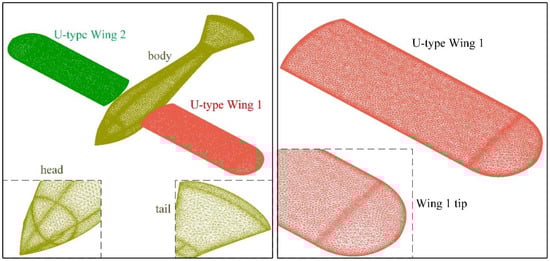 The size distribution used for meshing is shown in Table 3, where the global minimum size is used to improve the mesh quality of the complex geometric features of the whole aircraft surface. For the connection between the straight section and U-arc section of the wing, the grid density increase technology is also adopted.